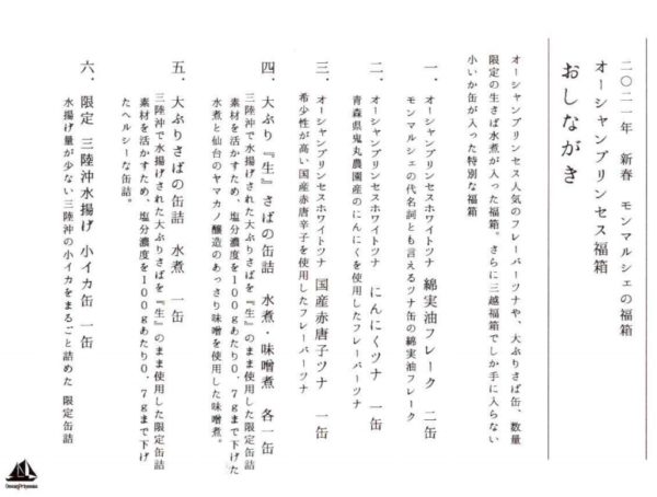 ■ 新館地下2階 モンマルシェモンマルシェの高級缶詰めセットは福袋は3,500円店頭で購入しました。小いかは三越限定です。