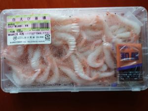 冷凍コーナーで購入回数が多いのが、原材料が白えびと塩のみで100gで¥880税込の白えび釜揚げです。