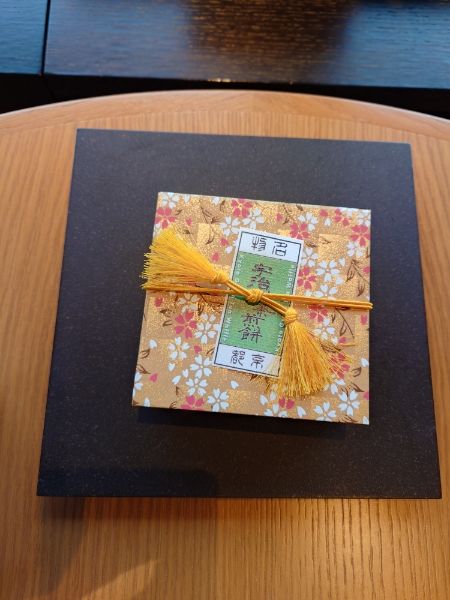 ウェルカムスイーツは二条若狭屋さんの宇治抹茶煎餅きれいな空き箱は小物入で自宅で使用しています。