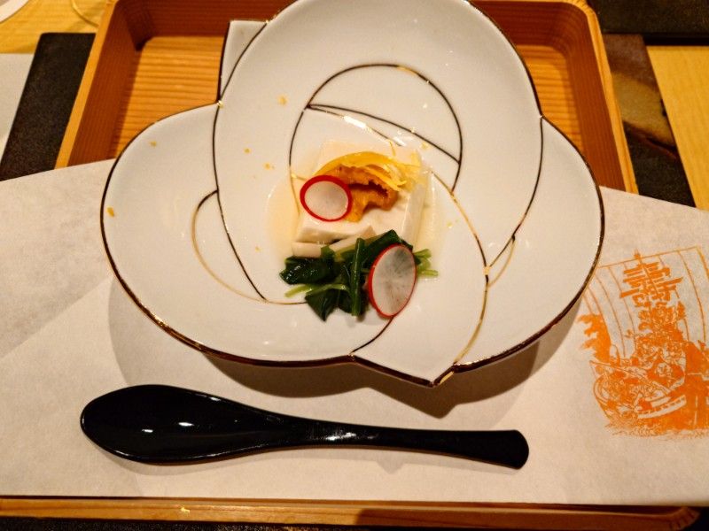 Van Tofis, Sea Urchin, Boiled Mibuna and Maitake Mushroom, Radish, Dashi Broth, Yuzu