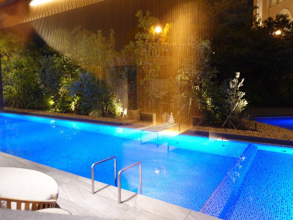 ガーデンプールが現れます。プールサイドはジャグジーが設備されており4月~10月は温水プールで泳ぐことが可能です。