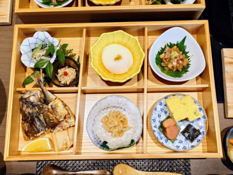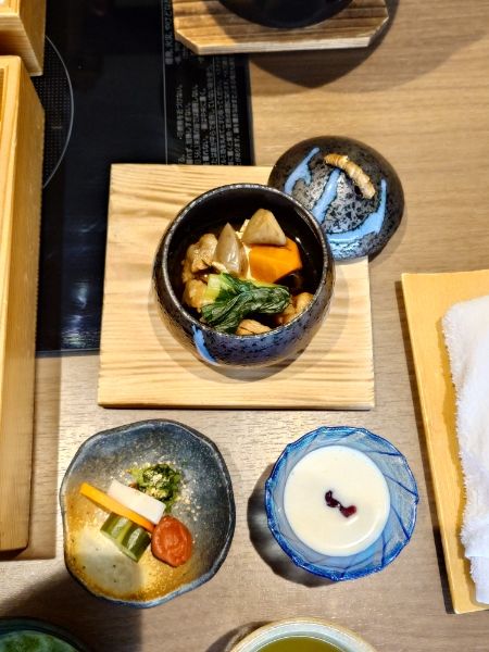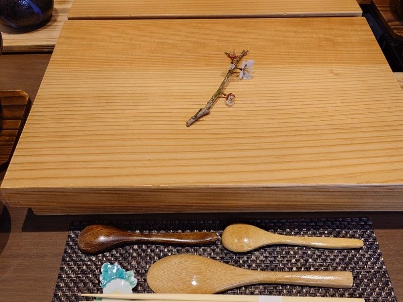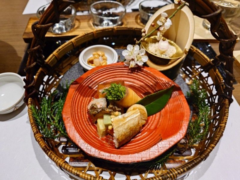 - 前菜: 納豆オイル漬け、蛤ぼんぼり和え、白魚雛寿司、鮎風干し、菜の花サーモン巻、小松菜卵焼き、など彩り豊かに