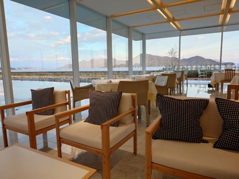 日没前の夕食レストラン 宮島が目の前に映し出されるロケーションです。