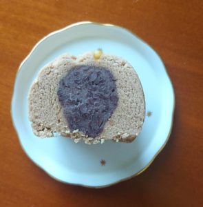 須坂にある盛進堂製菓舗の栗中華はまほろばの月のように、栗が丸々1つ入っています。さらに小豆で包まれたゴージャスな和菓子。