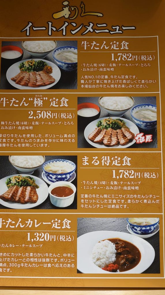 イートインは4種あり、人気NO1の牛たん定食¥1,782税込を店内厨房で職人さんが焼き上げてくれます。ご飯は少なめでお願いし、柔らか、それでいて張りのある6切れに南蛮味噌がピリ辛で美味しく、とろろは真白で、テール入りスープはとっても澄んでいて繊細でした。