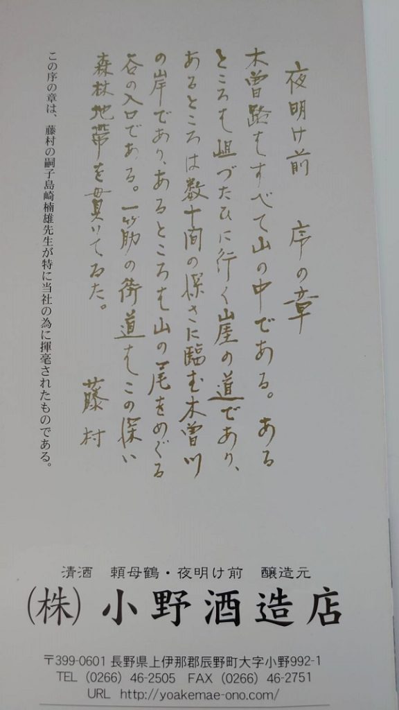 期間限定の蔵元の小野酒造店は島崎藤村の小説 『夜明け前』より商標登録許可を、初代藤村記念館館長より得て誕生した、1864年創業の長野県上伊那の歴史ある酒蔵です。