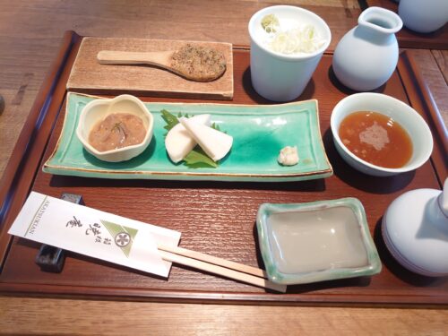 アルコール 提供されないのが、残念なセット内容の味噌、いたわさ、わさび漬け、イカのゆず塩辛のセットです。