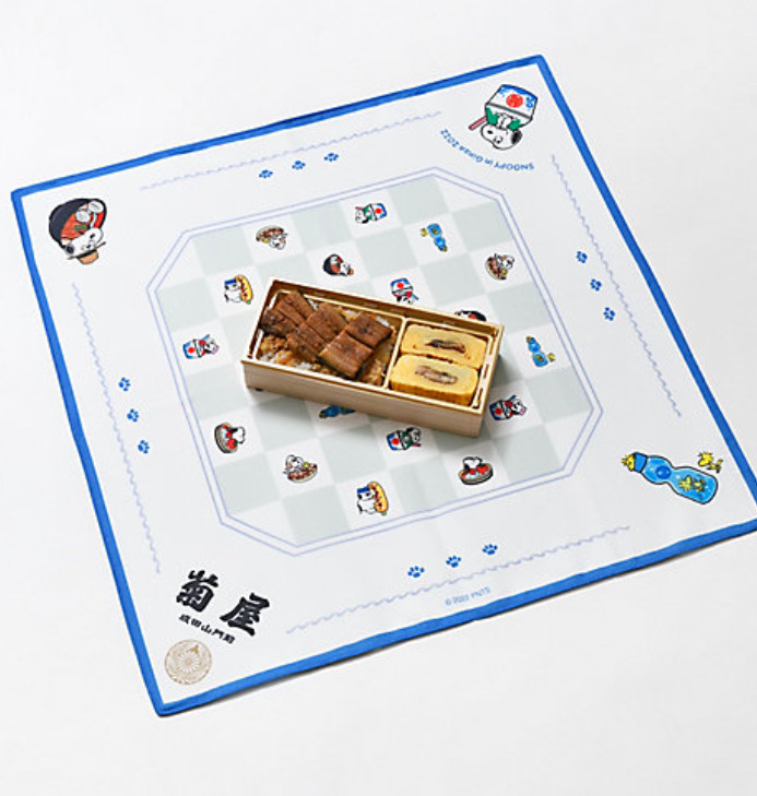 菊屋で大変人気の国産鰻蒲焼とう巻きが入ったお弁当に限定オリジナルデザインの風呂敷がついたセットです。3,001円