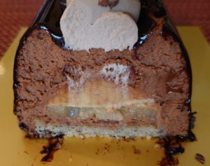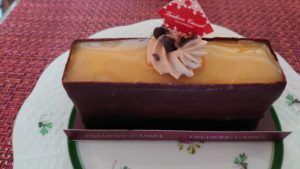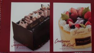 右のクロンヌ ドゥ ノエルはイチゴの果実を入れたヴァニラムース見た目がクリスマスリースのアートの様なクリスマスケーキ¥3,240税込サイズ12cm 12/25ジャクリーンのダークチョコレートはかなりの濃厚チョコレートで中の洋梨はサイコロ状でヘーゼルナッツとダークチョコレートの組み合わせが最高でした。クリームの飾りもリボンの様で美しいケーキでした。