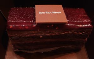 トップにはフランボワーズが細いプレートのようにきれいにコーティングされています。チョコレートムースとスポンジが美しい断層になっていて、甘過ぎず、フランボワーズの酸味と相まって、かるーくなめらかで特別感あるケーキです。