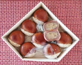 こぐりはひとくちサイズの、刻み栗がたくさん入った、かわいい栗の形のおまんじゅう(桃山)が8個、五角形の栗に見立てた折詰boxに入っています。賞味期限は6日程でした。864円