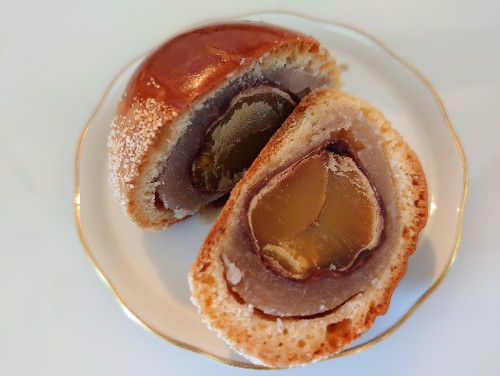 渋皮蜜煮丸々一粒を白小豆こしあんで包み焼き上げた、栗の形の焼き饅頭。