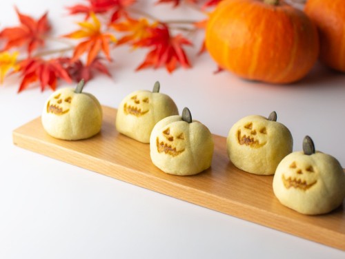 かぼちゃ粉末で色づけた小豆こしあん入り薯蕷饅頭にジャック・オ・ランタンの焼印、ヘタは焙煎したカボチャの種を突き刺さっています、翌日までの消費