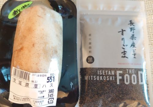 毎日食べようと心がけている根菜(いつもは長芋)と国産の伊勢丹三越FOODシリーズの黒ゴマはすりごまですぐに食べられ