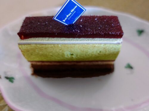 ピスタチオのムースの上にグリオットチェリー、ヴェネズエラ産カカオのムース