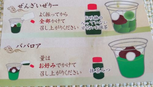 ババロア自体は甘さ控えめの濃い抹茶味が餡子と白玉と甘い抹茶みつは、個人的には半量で丁度良い甘さです。日持ちは当日なのでぜりーも購入してみたいです。