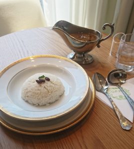 ランチセットのポテトサラダはシンプルな味付けに葉類には少し多めのドレッシング(ポテトサラダに味があるので、葉物にはかけない方が個人的には好み)がかかっていました。創業者が洋食レストランのオーナーシェフだったこともあり、魔法のランプのような形の懐かし容器(グレーリーボート)に入った、昭和レトロなカリーライスが運ばれてきました。牛肉のさらさら欧風カレーで、ルーの辛さは中辛より少し甘め位で好みで美味しかったですが、牛肉がスプーンで切ることの出来なく、しっかりサイコロ状の形状を残したタイプなので、柔らかとろとろタイプの好みの私には少しハードな感じでした。