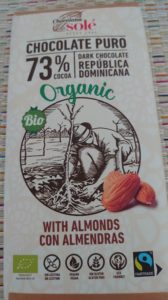 ひとかけらで、かなりの濃厚カカオのチョコレート🍫アーモンド入りオーガニックです。カカオ73%で乳化剤不使用です。