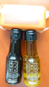 チーズはさておき、いぶるで1番人気はチーズでなく、調味料の1年熟成の醤油を燻製させた醤油と、スペイン産の燻製オリーブオイルだそうで、お試しサイズのセットを購入してみました。