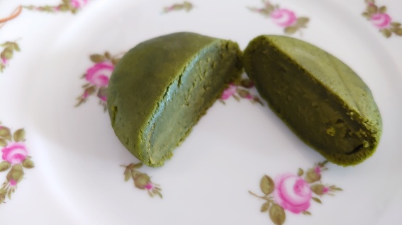 白いんげん豆の抹茶餡に抹茶ペーストが挟んである、抹茶好きにおススメな滑らかな舌触りです。95kal