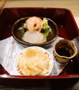 は餡掛け(みたらし餡のような甘いたれでした)のぶり寿司とわらのカバーの中には、昆布名産富山の、甘えび、くるま鯛、メカジキの昆布〆が入っていて
