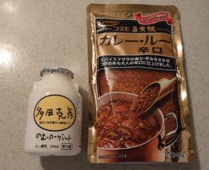 コスモの粉のルー辛口と違うルーを混ぜて使います。多田克彦のむヨーグルト&ヨーグルトも時々購入☺️