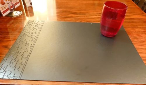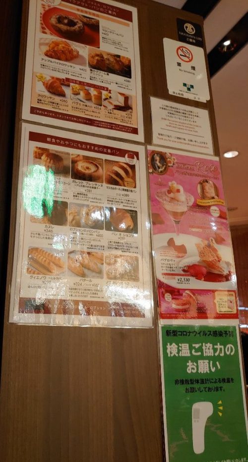 入店検温、消毒あり客席の準備待ちソファーの横には、パンのテイクアウトメニューが貼ってあります。
