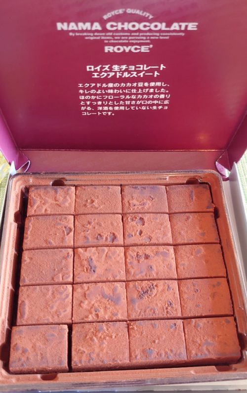 期間限定でロイズ生チョコレートが販売されていました。誰もが好きな⁉️生チョコれーとは、購入した事のないエクアドルカカオを使用した、エクアドルスイートを購入しました。苦味はなく甘めですが、お酒は使用なので、大人生チョコレートです。778円