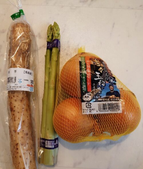 細身長芋青森県産198円 アスパラ298円 甘々淡路島玉ねぎ 324円