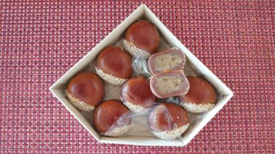 毎年秋の期間限定で販売されている、こぐりはひとくちサイズの、刻み栗がたくさん入った、かわいい栗の形のおまんじゅう(桃山)が8個、五角形の栗に見立てた折詰boxに入っています。賞味期限は6日程でした。栗の葉の雲平(うんぺいと読み)みじん粉や寒梅粉に砂糖を混ぜ水を加え生地にしたものに、四季折々の型抜きにしたもので、ラップに包まれ入っていたのに最後に気付きました。和菓子ならではの季節感を感じるひと手間です。¥864税込