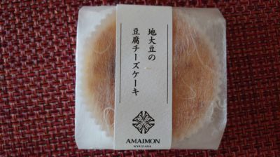地大豆の豆腐チーズケーキ¥260税込、賞味期限が翌日迄です。京都のお豆腐屋さん久在屋のお菓子工房のAMAIMON の商品で、ロールケーキと2種置いてあります。