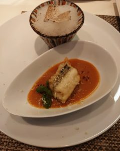 前菜 とうもろこしのロワイヤル は奥深い高級茶わん蒸し贅沢サマートリュフ味といった感じで、フレンチレストランのアミューズのようでした。穴子のフリットもコリアンダーがポイントのソバデアホソースが絶妙。