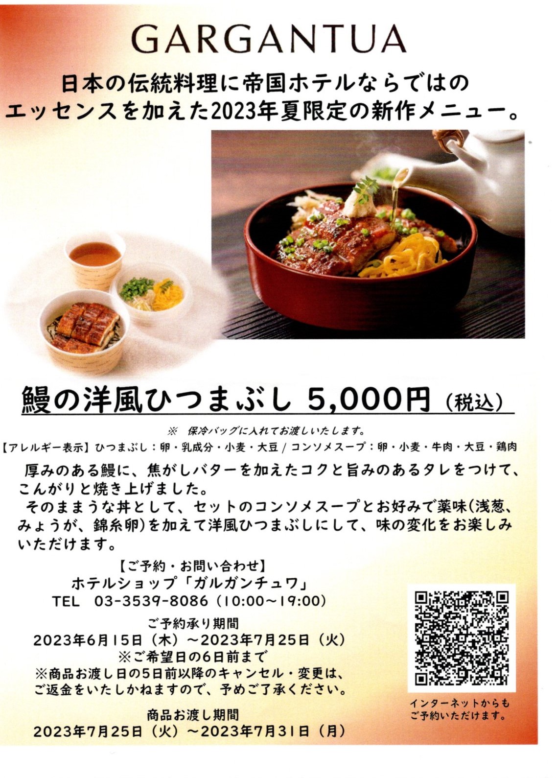 予約可能商品もあり、手土産にも好適です。7月までの限定は洋風ひつまぶしが限定メニューです。