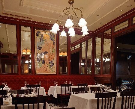 深紅のソファやミュシャの壁画に彩られたアール・ヌーボー調な雰囲気が漂う特別な空間です。