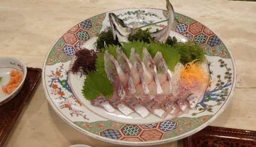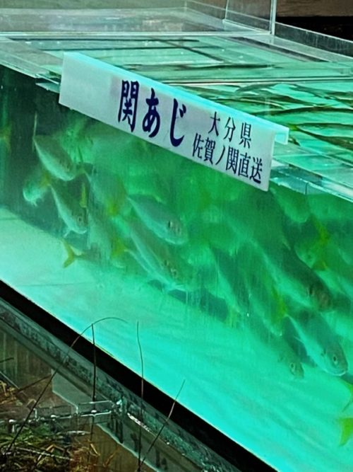 目の前の生け簀より、板前さんが網で、関あじを板場に運びます。🐟️