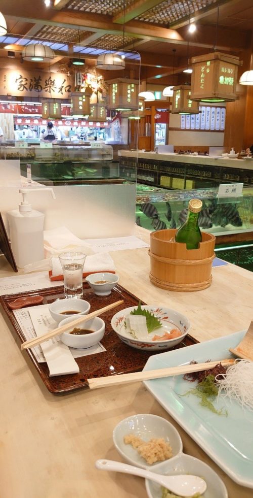 カウンター席は、隣席とはアクリル板で仕切られ、中央には大きな生け簀があるので、