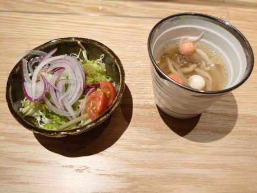 サラダとお肉だしの澄んだスープが付きます。(ちょっとぬるすぎたのが難点!?)