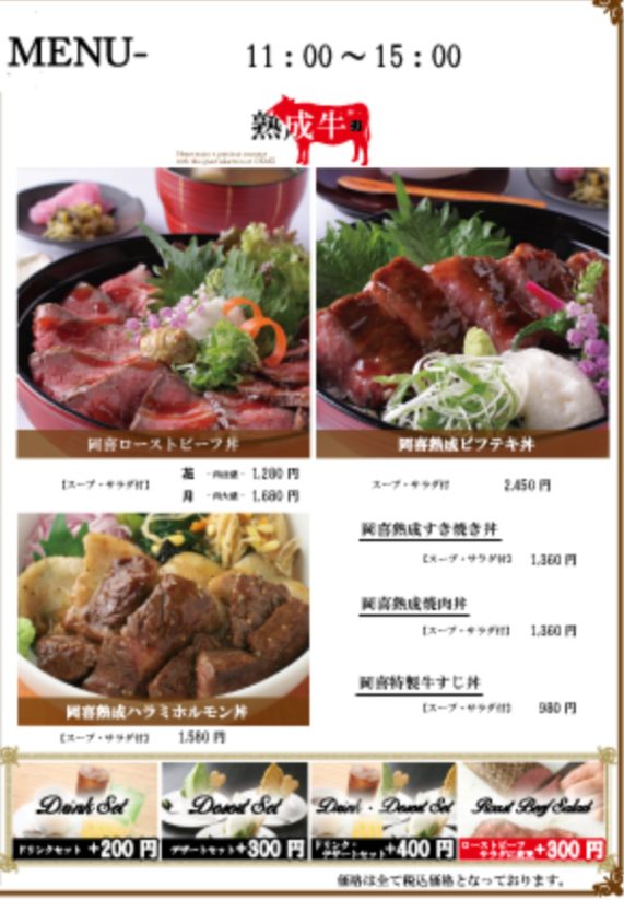 熟成肉はお得メニューもあり、ランチタイムは近隣のお勤めの方が多く熟成肉のローストビーフ丼が人気の様でした。熟成牛メニューは牛すじ丼980円~