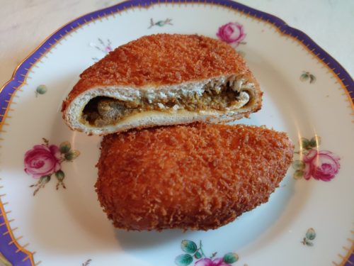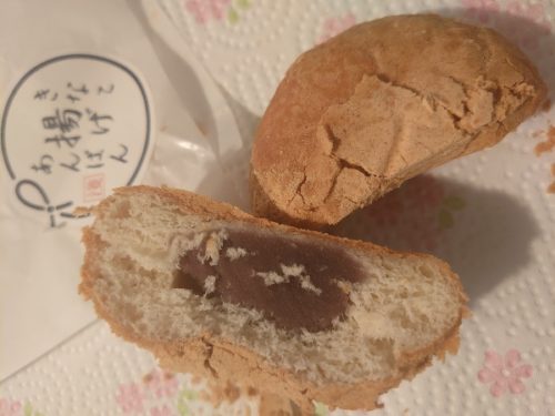 中身は、サラサラのきな粉がまぶされ、揚げあんぱんは、こし餡で揚げパンですが、さっぱりで、ほのかに塩味香ります。