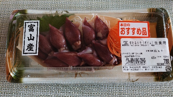 鮮魚売り場では、旬の富山産ホタルイカは大きくぷりぷりでした。