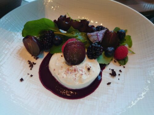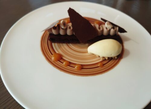 ジャンドゥーヤは北海道産のミルキーアイスクリームと杏子ソースの美しいアートプレートでした。