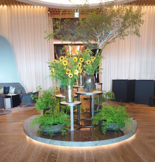 ロビーフラワーアートは🌻ヒマワリで夏らしくなり