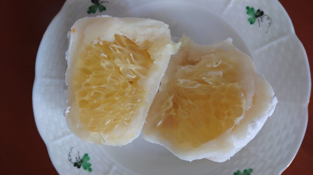 中のはっさくはフレッシュで、白餡の程よい甘さと組合わさり、絶妙なバランス大福です☺果汁が外皮に染みでないのが、不思議です。