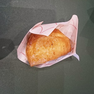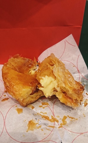 東京ミッドタウン日比谷の地下1階に、土日は特に行列(右下写真の赤ロープにずらーり)のアップルパイのみを販売しているその名の通りの『RINGO』。まだ午前中からか、空いていたので初めて購入しました。焼きたてでまだ温かく、着席できるテーブルがミッドタウン共有部にあるので、早速ひとついただいてみました。かなりの層の数のサラサク生地からカスタードクリームがあふれ出しキューブ状のリンゴがゴロゴロ出てきます。あっという間に食べ終わりましが、バターたっぷりのため、かなり手はオイリーになります。おしぼりはついてないので要注意です。おひとり様購入8個までと看板があります。