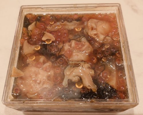 大粒の鮑、いくら、ボイルほたてつぶ貝がカツオ、昆布のお出汁に漬け込まれています。