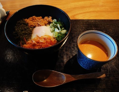 掛だし用の、桜えびでだしを取った後の桜えびを大根おろしで合えた、海老おろし、温玉、わけぎ、青海苔を揚げた天玉、桜えび揚げ