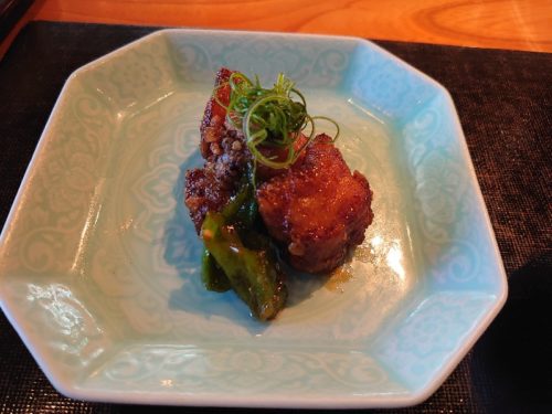 河豚香味揚げ、ししとう、かもじ葱(白以外の食材に髪にみたてた葱)
