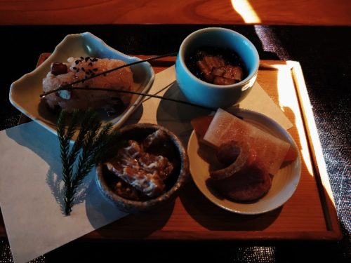合鴨ロース、からすみ(自家製)、赤飯、海宝漬け、割干し大根白和え