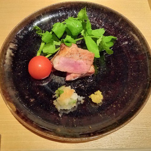 高タンパク、低脂肪の鴨の炙り焼きは弾力があり、クレソンやトマトの付合わせ