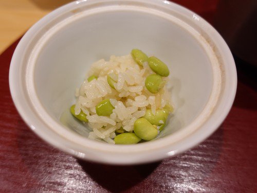 中身はお豆ごはんに真丈と?〆のような先付けですが、お豆はホクホク